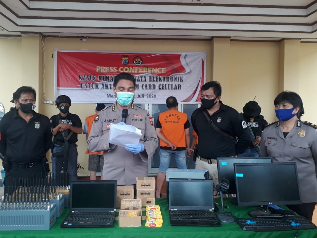 Manado, LintasUtara.com – Tim Khusus Maleo Polda Sulawesi berhasil mengungkap pemalsuan data elektronik aktivasi Sim Card Celular, berdasarkan LP/303/VII/2020/SULUT/SPKT, 19Juli 2020.