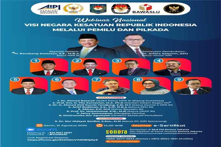 Webinar dengan tema, “Visi Negara Kesatuan Republik Indonesia (NKRI) Melalui Pemilu dan Pilkada”, menghadirkan narasumber: Ahmad Basarah (Wakil Ketua MPR), Tito Karnavian (Mendagri), Arif Budiman (Ketua KPU), Abhan (Ketua Bawaslu), Muhamad (Ketua DKPP).