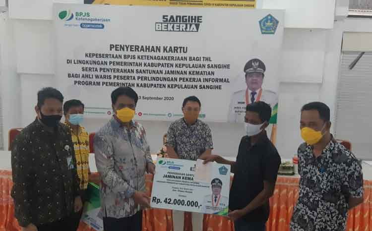 JEG dalam sambutannya mengatakan, dengan diasuransikanya para pekerja, baik sektor formal maupun informal di Kabuapten Kepulauan Sangihe, menunjukan kehadiran dan kepedulian pemerintah untuk memproteksi para pekerja.