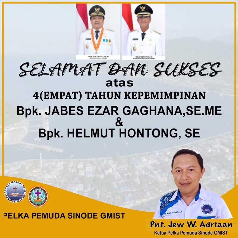 “Selamat dan Sukses atas 4 (empat) Tahun Kepemimpinan Bpk. Jabes Ezar Gaghana, SE. ME dan Bpk. Helmut Hontong SE,” ungkap Ketua Pelka Pemuda Sinode GMIST, Pnt. Jew W. Adriaan.