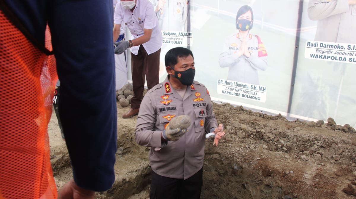 Peletakan batu pertama pembangunan dua Mako Polres tersebut dipusatkan di lahan pembangunan Mapolres Bolmong, yang berlokasi di Desa Dulagon, Kecamatan Lolak, Kabupaten Bolmong. Dirangkaikan dengan penanaman bibit pohon kelapa di lokasi setempat.