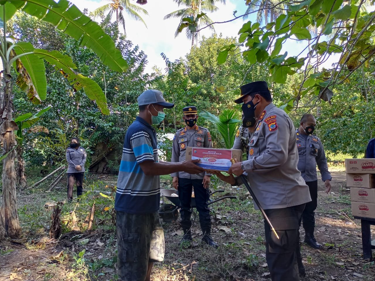 Kapolda yang didampingi Dirbinmas Kombes Pol Dumadi dan Kabid Humas Kombes Pol Jules Abraham Abast, berturut-turut menyerahkan bantuan sosial (bansos) berupa sembako secara simbolis kepada warga setempat.