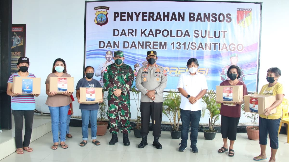 Bansos bagi masyarakat diserahkan secara simbolis oleh Kapolda Sulut, Kasrem 131/Santiago Kolonel Arm Franky Watuseke, Bupati, dan Kapolres kepada perwakilan warga.