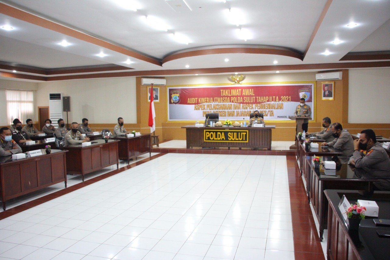 Audit kinerja yang direncanakan berlangsung hingga Oktober 2021 nanti, diawali dengan Taklimat Awal di aula Tribrata Polda Sulut, Rabu (15/9/2021), dipimpin oleh Wakapolda Sulut Brigjen Pol Johnny Eddizon Isir didampingi Irwasda Polda Sulut Kombes Pol Tedjo Dwikora.