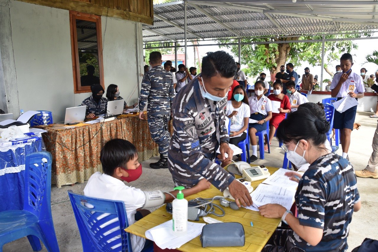 Serbuan vaksinasi masyarakat maritim yang dilakukan Lantamal VIII kali ini menurunkan tiga dokter dan puluhan tenaga kesehatan serta vaksinator dari Dinas Kesehatan (Diskes) Lantamal VIII dan Puskesmas Mubune Likupang.
