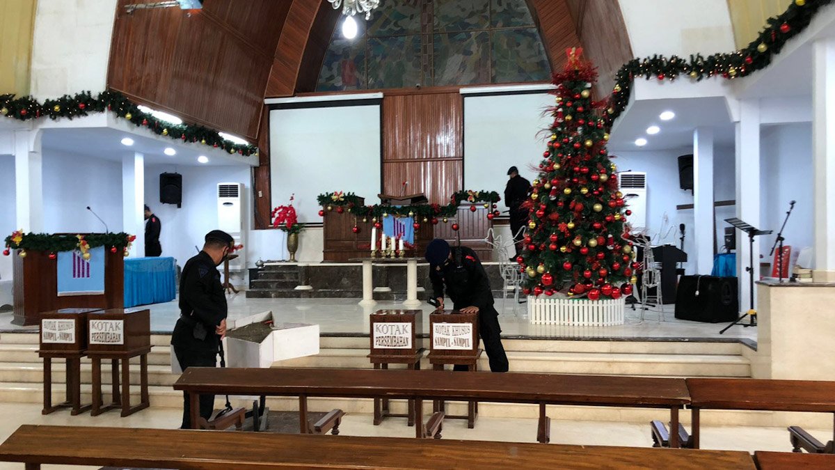 Selain sterilisasi, aparat Kepolisian dari gabungan fungsi juga disiagakan untuk melaksanakan pengamanan saat ibadah Natal berlangsung.