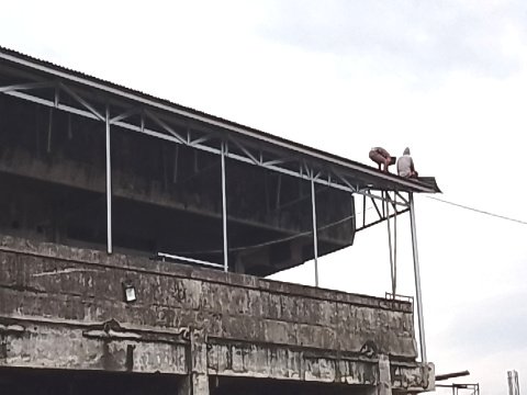 Terlihat dua orang pekerja berada diatas atap pbagunan tidak menggunakan alat pelengkap diri, sedangkan posisnya berada di tempat yang tinggi berkisar 20 meter dari atas tanah.