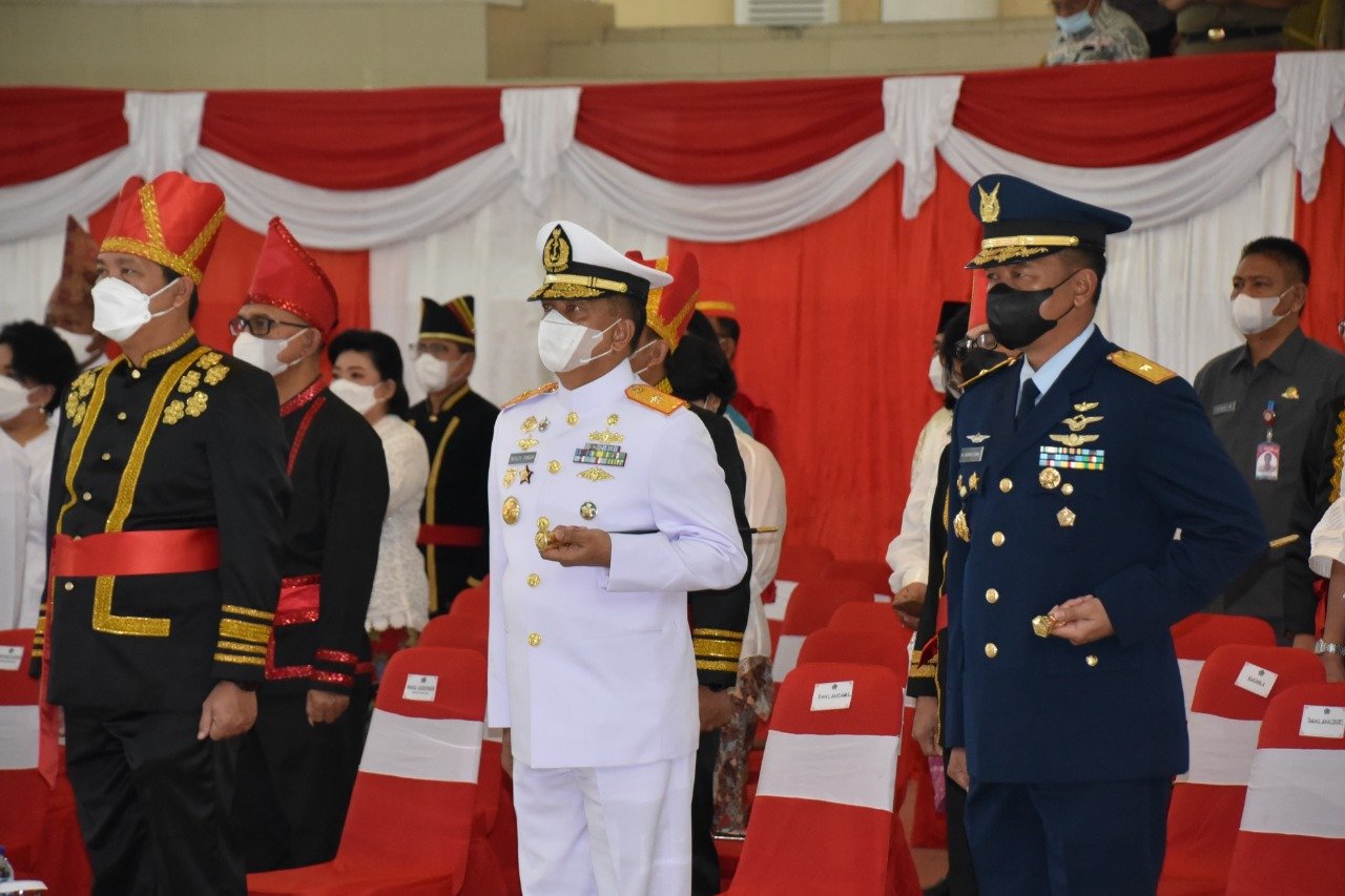Manado, Lintasutara.com — Bertempat di Aula Mapalus Kantor Gubernur Sulut, Jl. 17 Agusstus No. 69 Manado, Komandan Pangkalan Utama TNI AL (Danlantamal) VIII Manado Laksamana Pertama TNI Nouldy J. Tangka mengikuti upacara peringatan Hari Lahir Pancasila secara virtual yang di gelar Pemerintah Provinsi Sulawesi Utara. Rabu (1/6/2022).