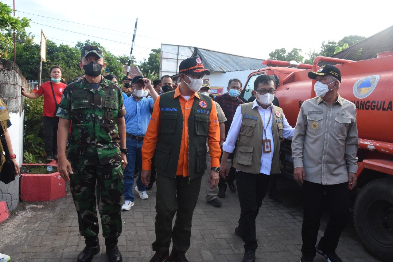 Seusai peninjauan ke lokasi bencana alam, Ketua BNPB dan Danrem 131/Santiago beserta rombongan menyempatkan ke pengungsian dan berdialog dengan masyarakat serta memberikan bantuan berupa sembako secara simbolis.