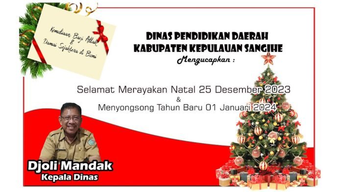 Keluarga Besar Dinas Pendidikan dan Kebudayaan Daerah Kabupaten Kepulauan Sangihe mengucapkan selamat Natal 25 Desember 2023 dan menyongsong tahun baru 01 Januari 2024.