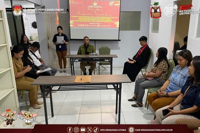 Minut, Lintasutara.com — Komisi Pemilihan Umum Kabupaten Minahasa Utara (KPU Minut) menggelar Pelantikan dan Pengambilan Sumpah Janji pengganti anggota Panitia Pemungutan Suara (PPS), Selasa (23/7/2024) di Kantor KPU Minahasa Utara, Airmadidi.