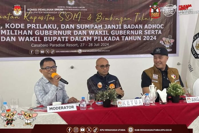 Minut, Lintasutara.com — Komisi Pemilihan Umum (KPU) Kabupaten Minahasa Utara mengelar Penguatan Kapasitas SDM dan Bimtek Kode Etik, Kode Prilaku dan Sumpah Janji Badan Adhoc dalam Pemilihan Gubernur dan Wakil Gubernur serta Bupati dan Wakil Bupati dalam Pilkada Tahun 2024.