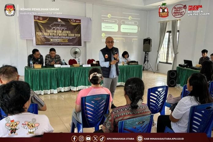 Minut, Lintasutara.com — KPU Kabupaten Minahasa Utara melaksanakan Sosialisasi Tahapan dan Jadwal Pemilihan Kepala Daerah Tahun 2024 kepada Tokoh Agama, Tokoh Masyarakat, Tokoh Pemuda dan Pemerintah di Desa Watutumou, Kecamatan Kalawat pada Jumat (26/7/2024) bertempat di Balai Desa Watutumou.