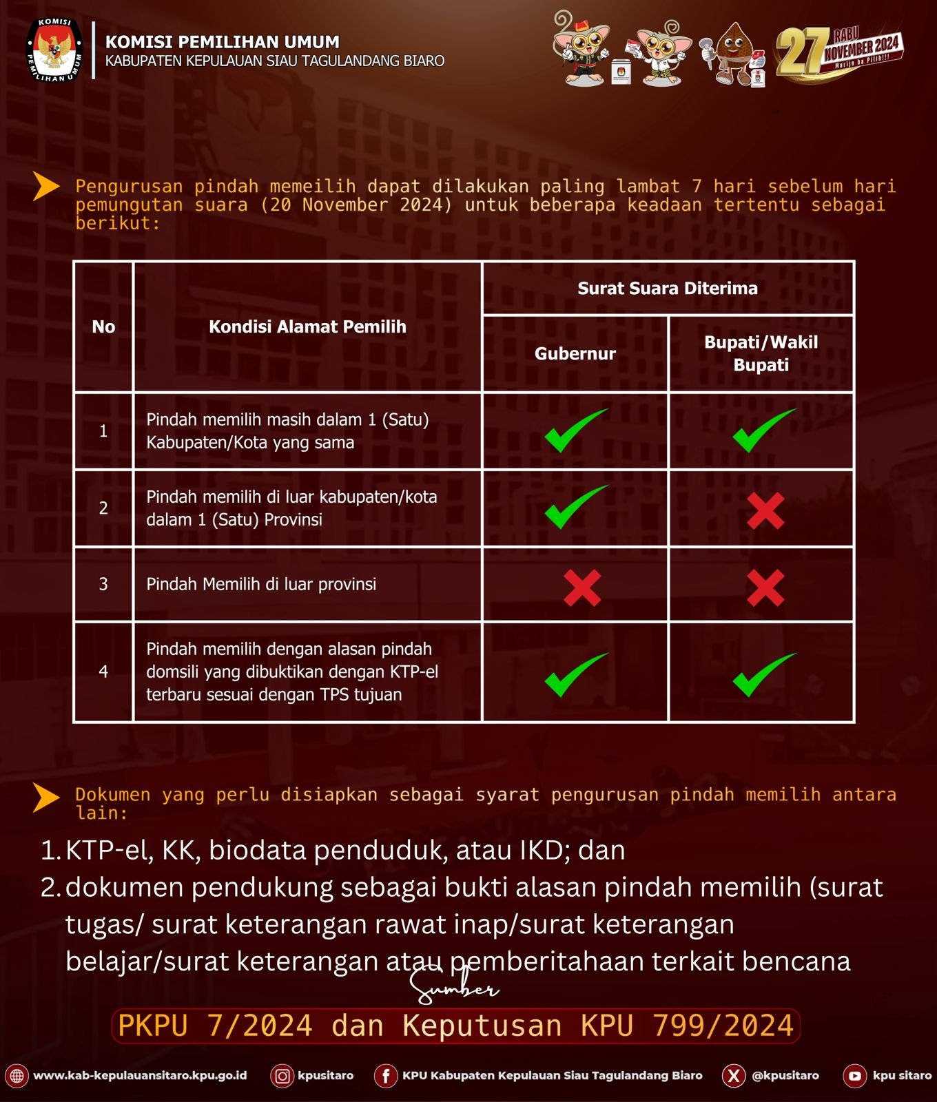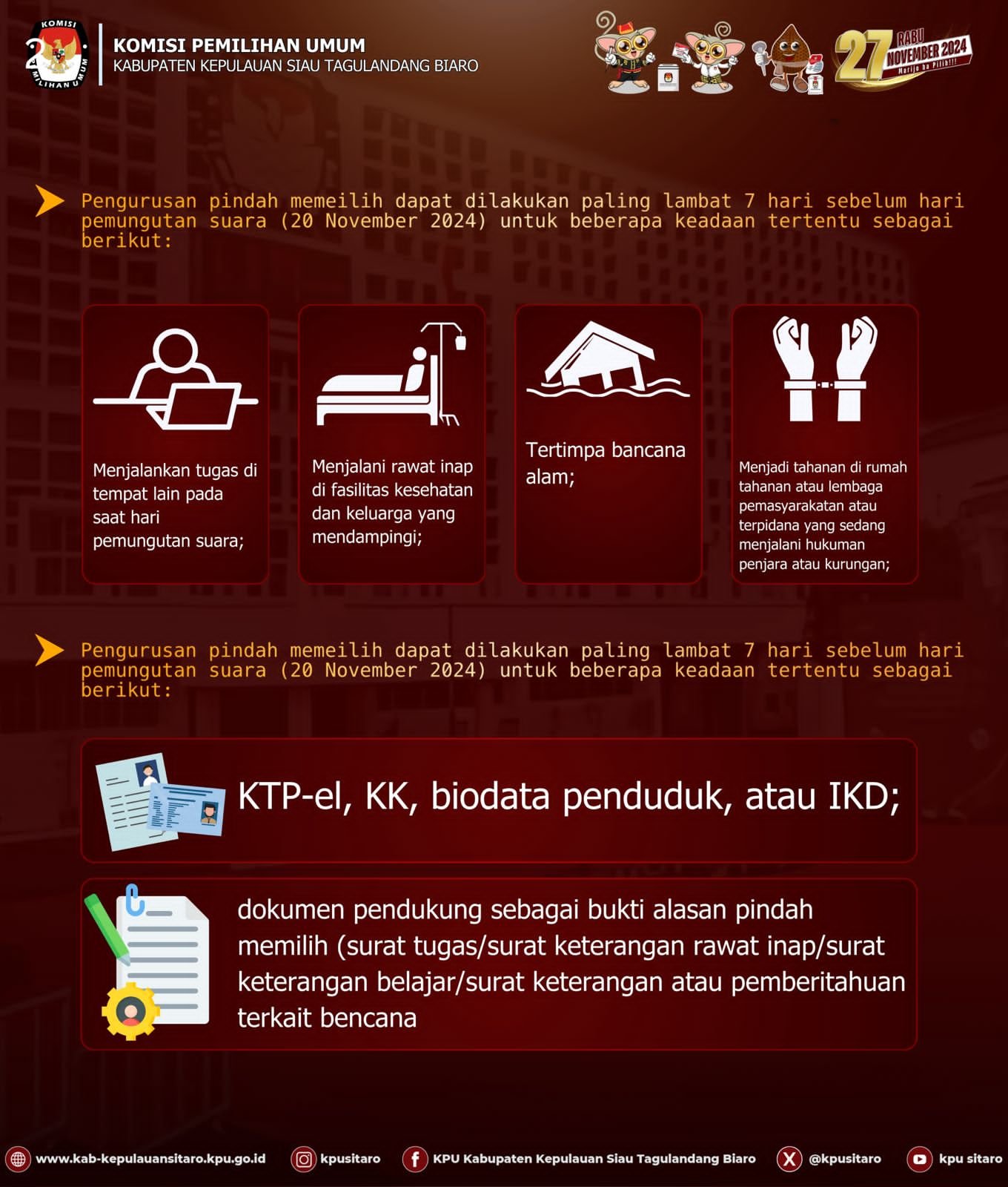 Ketua KPU Kabupaten Kepulauan Sitaro, Stevanus Kaaro melalui Kadiv Data Frismar B. Siramba menjelaskan, untuk masyarakat Sitaro yang sudah terdaftar dalam DPT Pemilihan 2024, akan tetapi karena keadaan tertentu tidak dapat menggunakan hak pilih di TPS tempat anda terdaftar.